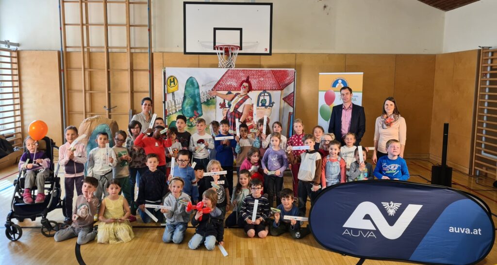 465 Kinder aus sieben Volksschulen steiermarkweit konnten heuer am Projekt „Sch(l)au voraus“ des Vereins GROSSE SCHÜTZEN KLEINE teilnehmen. Ziel dieses Projekts ist es, die Schüler*innen für Unfallgefahren am Schulweg und in der Schule zu sensibilisieren und ihnen zu zeigen, wie sie sich selbst und andere schützen können. Als Projektabschluss kommt die so gar nicht gefahrenbewusste, allzu unbekümmerte Clownin Popolina mit ihrem bunten Programm an die Schulen. Finanziert wird das Projekt von der AUVA-Landesstelle Graz.