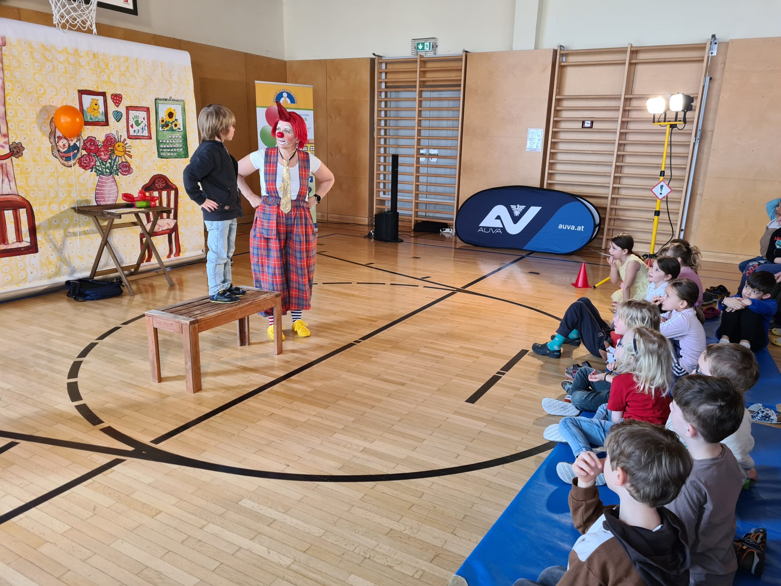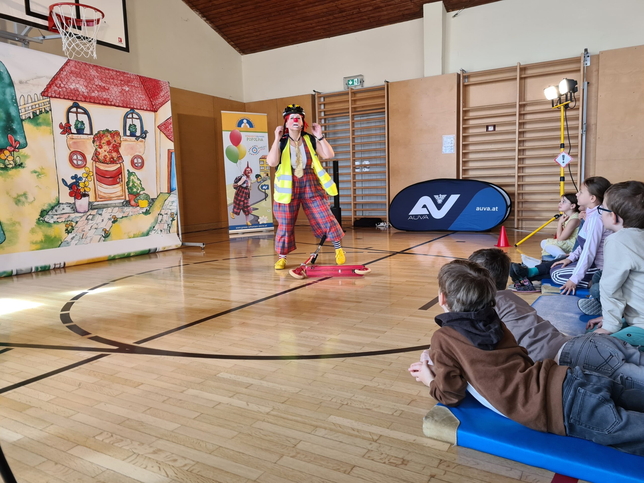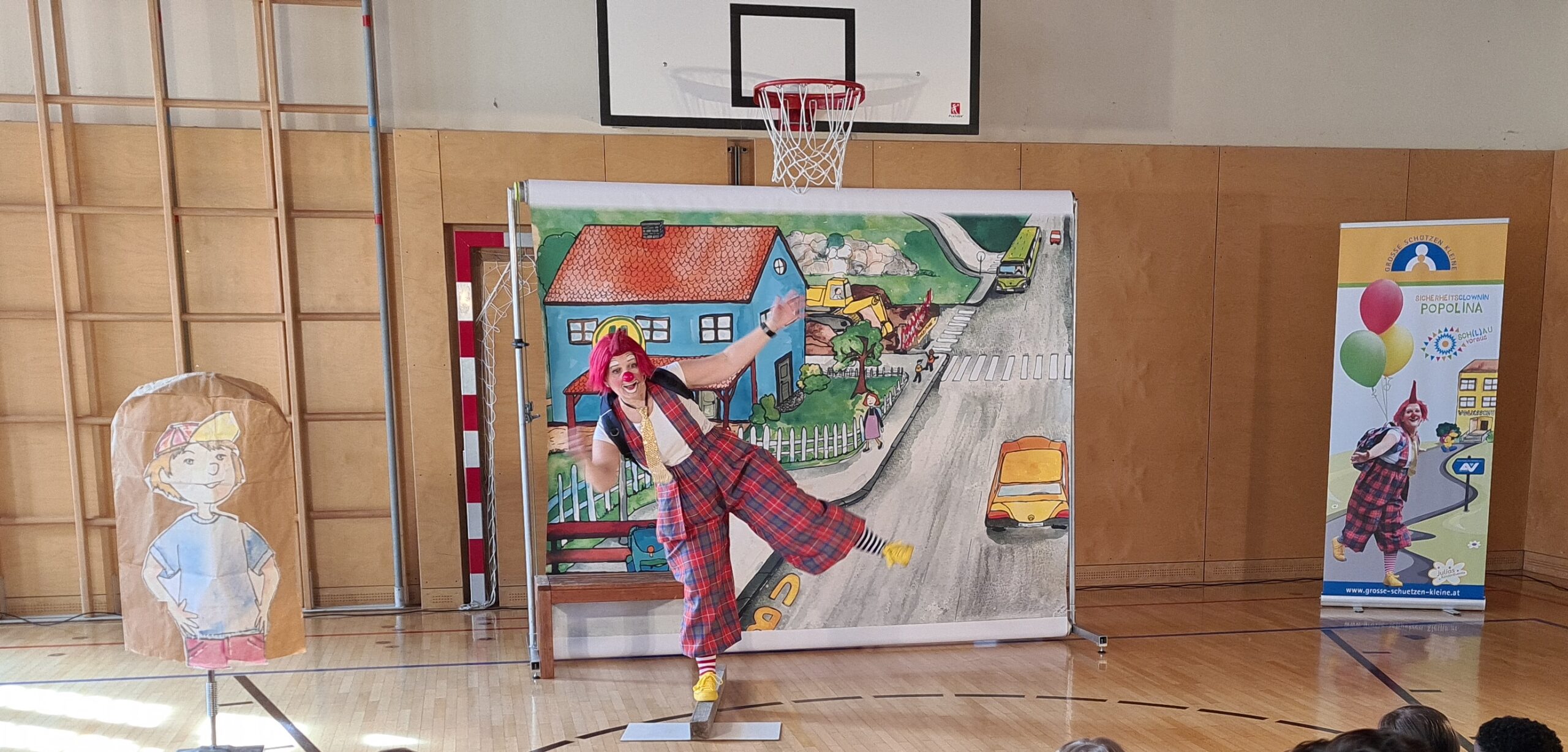 465 Kinder aus sieben Volksschulen steiermarkweit konnten heuer am Projekt „Sch(l)au voraus“ des Vereins GROSSE SCHÜTZEN KLEINE teilnehmen. Ziel dieses Projekts ist es, die Schüler*innen für Unfallgefahren am Schulweg und in der Schule zu sensibilisieren und ihnen zu zeigen, wie sie sich selbst und andere schützen können. Als Projektabschluss kommt die so gar nicht gefahrenbewusste, allzu unbekümmerte Clownin Popolina mit ihrem bunten Programm an die Schulen. Finanziert wird das Projekt von der AUVA-Landesstelle Graz.