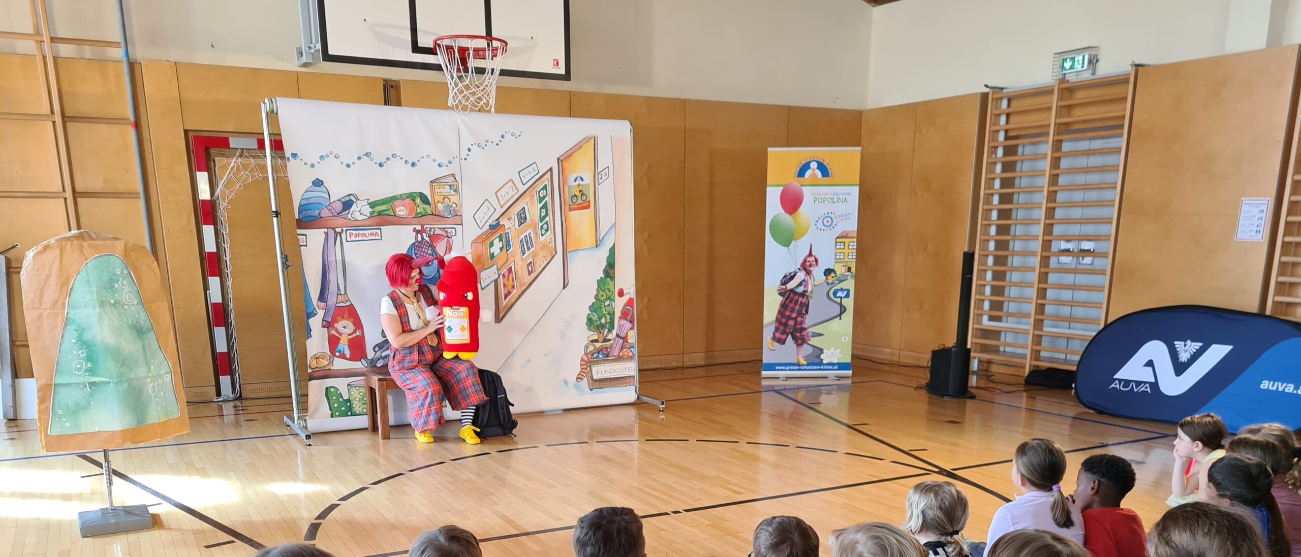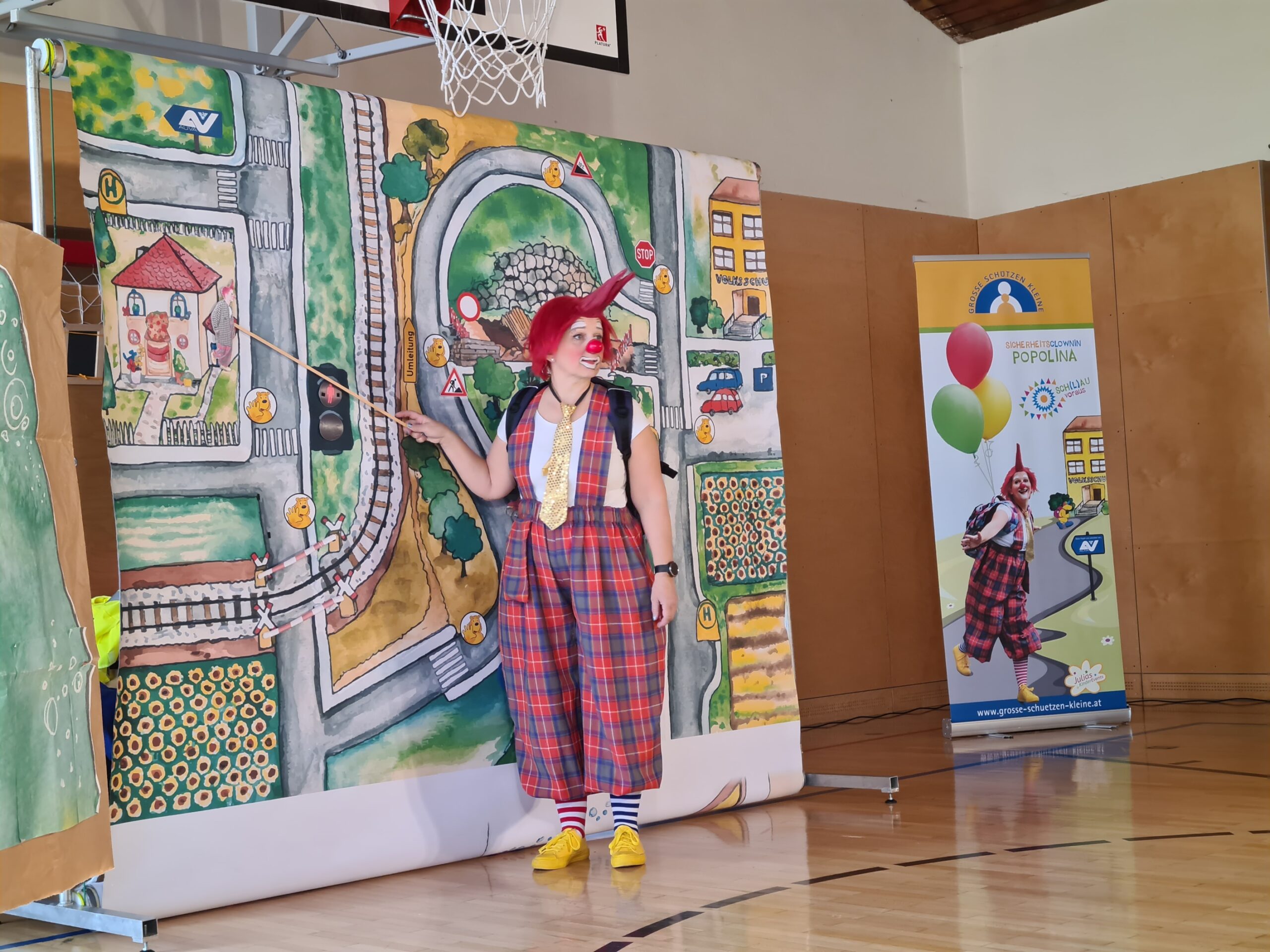 Der Höhepunkt dieses speziell für Erst- und Zweitklässler*innen konzipierten Unfallpräventions-projekts ist der Besuch von Popolina – einer Clownin, die so gar nicht gefahrenbewusst und zudem äußerst leichtsinnig ist. So begibt sich Clownin Popolina, dargestellt von Julia Schwarzbauer, während ihres Auftritts zahlreiche Male in Gefahr. Um der Clownin beschützend und beratend zur Seite zu stehen, bereiten sich die Volksschüler*innen mit ihren Pädagogen und Pädagoginnen mithilfe der speziell aufbereiteten Projektunterlagen (Spiele, Rätsel, Arbeitsblätter & Co) bereits Wochen vor Popolinas Besuch vor.